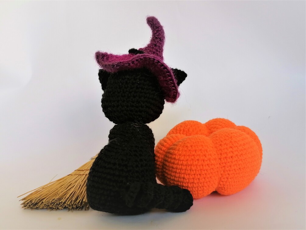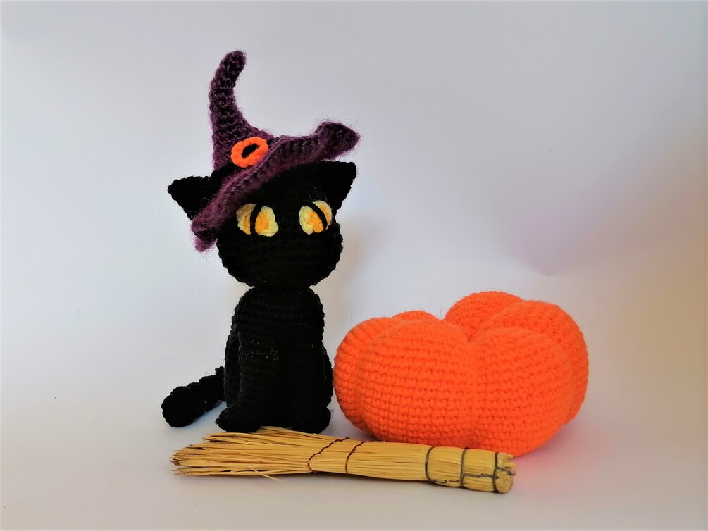 Crocheted Little Witch. Halloween black cat and pumpkin.